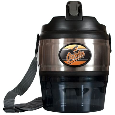 Baltimore Orioles large sports jug. This Orioles jug holds 80 ounces of cold or hot beverages and features a removable bottom section to hold your snacks. The upper section is insulated to help keep your beverage hot or cold longer and is made of sanitary stainless steel. Decorated with a high quality Orioles logo. Go Orioles!